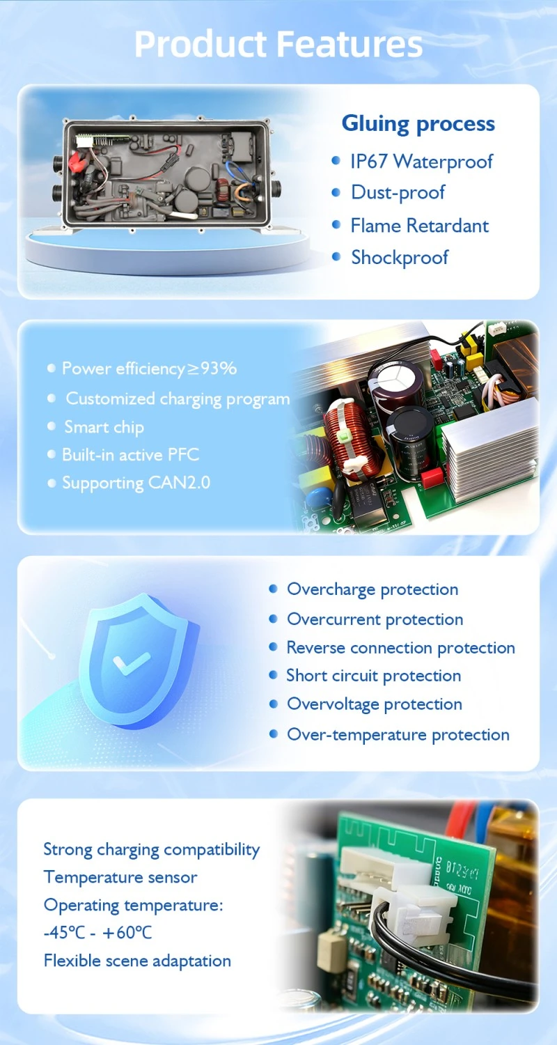 အလူမီနီယံအလွိုင်းခွံသည် ပလပ်စတစ်ခွံများနှင့် နှိုင်းယှဉ်ပါက 35% အပူပျံ့နှံ့မှု ထိရောက်မှုကို တိုးမြှင့်ပေးကာ ဆက်တိုက် 1.2kW လည်ပတ်မှုအတွင်း အားသွင်းကိရိယာ၏ လည်ပတ်မှုအပူချိန်ကို 60 ℃ အောက်တွင် ထားရှိကာ အတွင်းပိုင်းအစိတ်အပိုင်းများကို ကာကွယ်ကာ ဝန်ဆောင်မှုသက်တမ်းကို တိုးမြှင့်ပေးသည်။ ထို့အပြင်၊ ဗို့အားပိုကာကွယ်မှု (55V max)၊ over-current protection (28A max)၊ short-circuit protection နှင့် over-temperature protection ၊ over-voltage protection (55V max)၊ over-current protection (28A max) အပါအဝင် multi-layer safety protection ယန္တရားများကို တပ်ဆင်ထားပြီး၊ charger နှင့် battery ကို ထိခိုက်ပျက်စီးမှုမှ ထိရောက်စွာကာကွယ်ပေးပြီး on-board ပတ်ဝန်းကျင်အားလုံးတွင် လုံခြုံစွာလည်ပတ်နိုင်စေပါသည်။