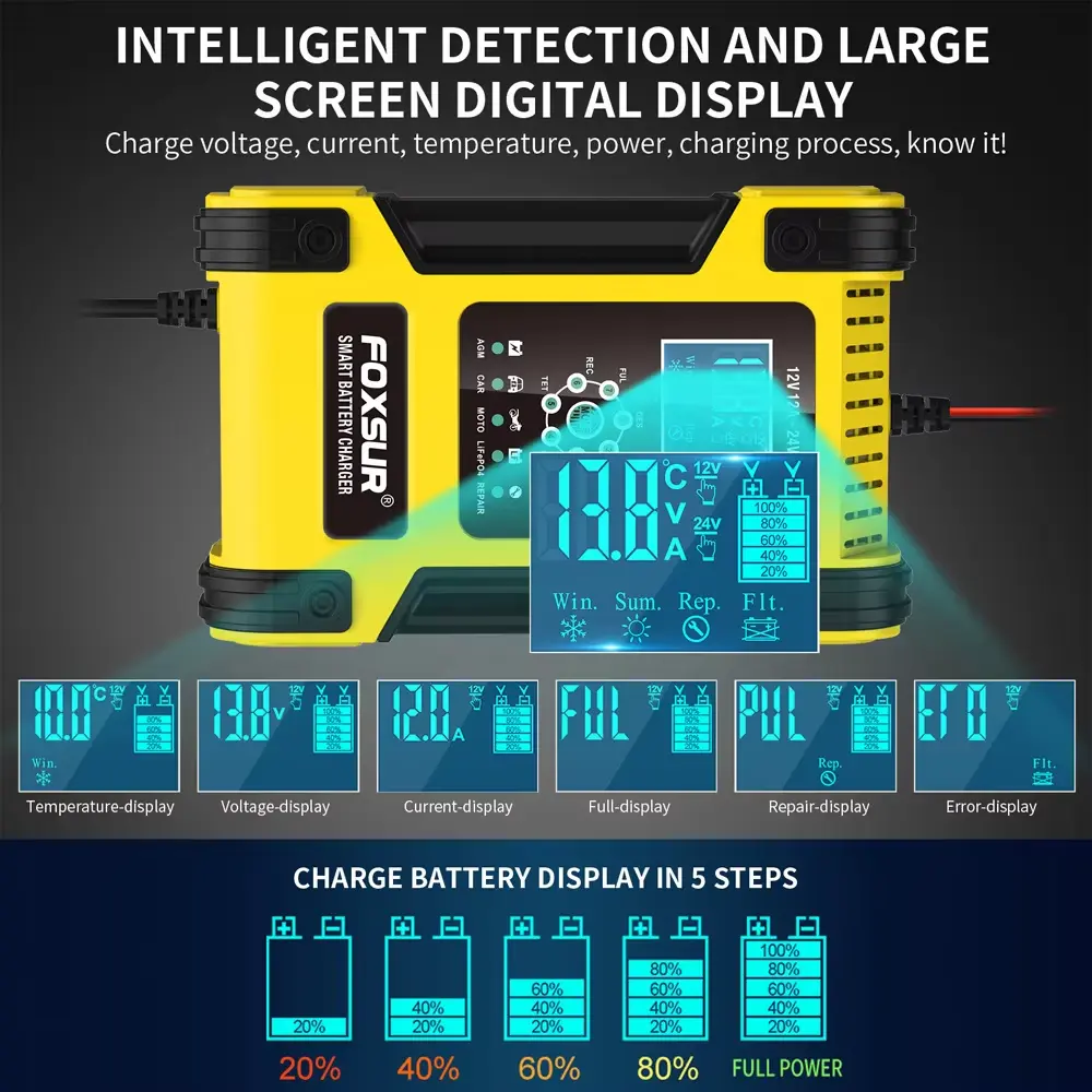 • 7 အဆင့်အားသွင်းကိရိယာများသည် Calcium၊ Gel AGM၊ LiFePo4၊ Wet၊ lead Acid ဘက်ထရီများအပါအဝင် ဘက်ထရီအမျိုးအစားအများစုအတွက် သင့်လျော်သည်။ ၎င်းတို့သည် ကုန်သွားသော နှင့် ဆာလ်ဖပ်ဘက်ထရီများကို ပြန်လည်ထူထောင်ရာတွင်လည်း ကူညီပေးနိုင်ပါသည်။