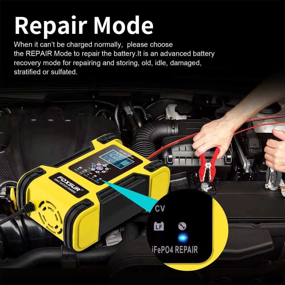 Intelligent Repair Function- ထည့်သွင်းထားသော pulse desulfation မုဒ်သည် sulfated ဘက်ထရီများကို ပြန်လည်ရယူပြီး ဆုံးရှုံးသွားသော စွမ်းရည်ကို ပြန်လည်ရယူရန် ကူညီပေးသည်။