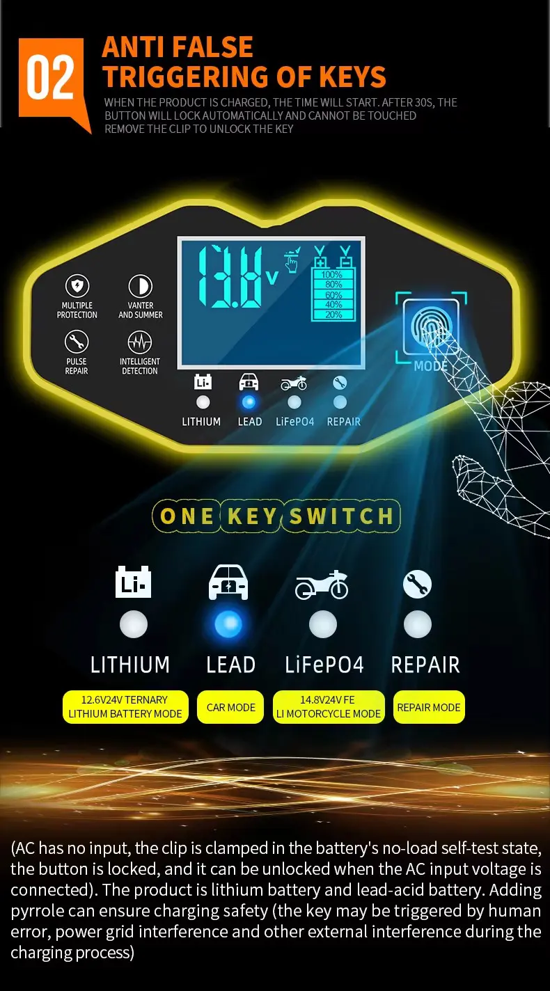 1. စမတ်နှင့် လိုက်ဖက်သည်။ ZYX-J40 သည် ခဲ-အက်ဆစ်၊ AGM၊ Gel၊ EFB၊ Li-ion နှင့် LiFePO₄ (လီသီယမ်သံဖော့စဖိတ်) အပါအဝင် ဈေးကွက်ရှိ ဘက်ထရီအမျိုးအစားတိုင်းနီးပါးကို ပံ့ပိုးပေးပါသည်။ ကျယ်ပြန့်သောစွမ်းရည် 2Ah မှ 150Ah ဖြင့်၊ ၎င်းသည် မော်တော်ဆိုင်ကယ်ဘက်ထရီငယ်များမှသည် ကားဘက်ထရီကြီးများအထိ အရာအားလုံးကို ကိုင်တွယ်နိုင်သည်။