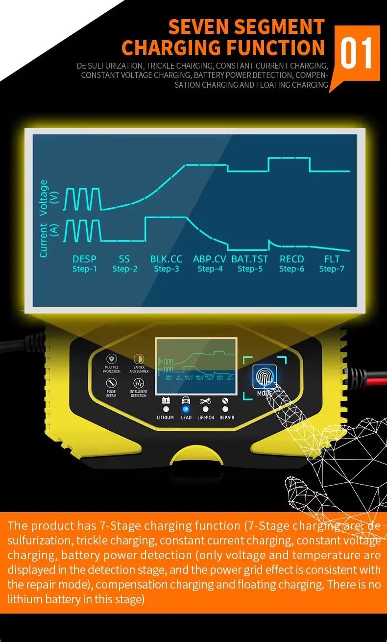 7 အဆင့်အားသွင်းကိရိယာများသည် Calcium၊ Gel AGM၊ Wet၊ Lithium အပါအဝင် ဘက်ထရီအမျိုးအစားအများစုအတွက် သင့်လျော်သည်။ ခဲအက်ဆစ်။ LifePo4 ဘက်ထရီ။ ၎င်းတို့သည် ကုန်သွားသော နှင့် ဆာလ်ဖပ်ဘက်ထရီများကို ပြန်လည်ထူထောင်ရာတွင်လည်း ကူညီပေးနိုင်ပါသည်။