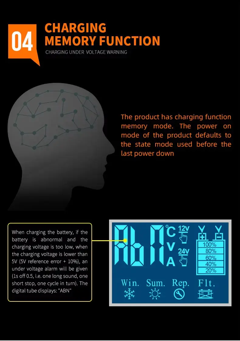 2. အကောင်းဆုံးအားသွင်းခြင်းစွမ်းဆောင်ရည် ဤအားသွင်းကိရိယာသည် 3A တွင် 12V နှင့် 24V တွင် 12V နှင့် 3A တွင် 110W နှင့် အမြင့်ဆုံးအားသွင်းနိုင်မှု 85% ဖြင့် အားအပြည့်သွင်းနိုင်သည်။ အလိုအလျောက် 7 အဆင့် စမတ်အားသွင်းပရိုဂရမ်တွင် desulfation၊ soft start၊ bulk charging၊ absorption၊ analysis၊ reconditioning နှင့် float maintenance တို့ ပါဝင်ပါသည်။ သီးသန့်ဆောင်းရာသီမုဒ်သည် အေးသောအပူချိန်တွင် အားသွင်းခြင်းကိုသေချာစေပြီး LCD မျက်နှာပြင်သည် အားသွင်းဗို့အား၊ လက်ရှိနှင့် ဘက်ထရီအပူချိန်တို့ကို အချိန်နှင့်တပြေးညီ စောင့်ကြည့်နိုင်မည်ဖြစ်သည်။