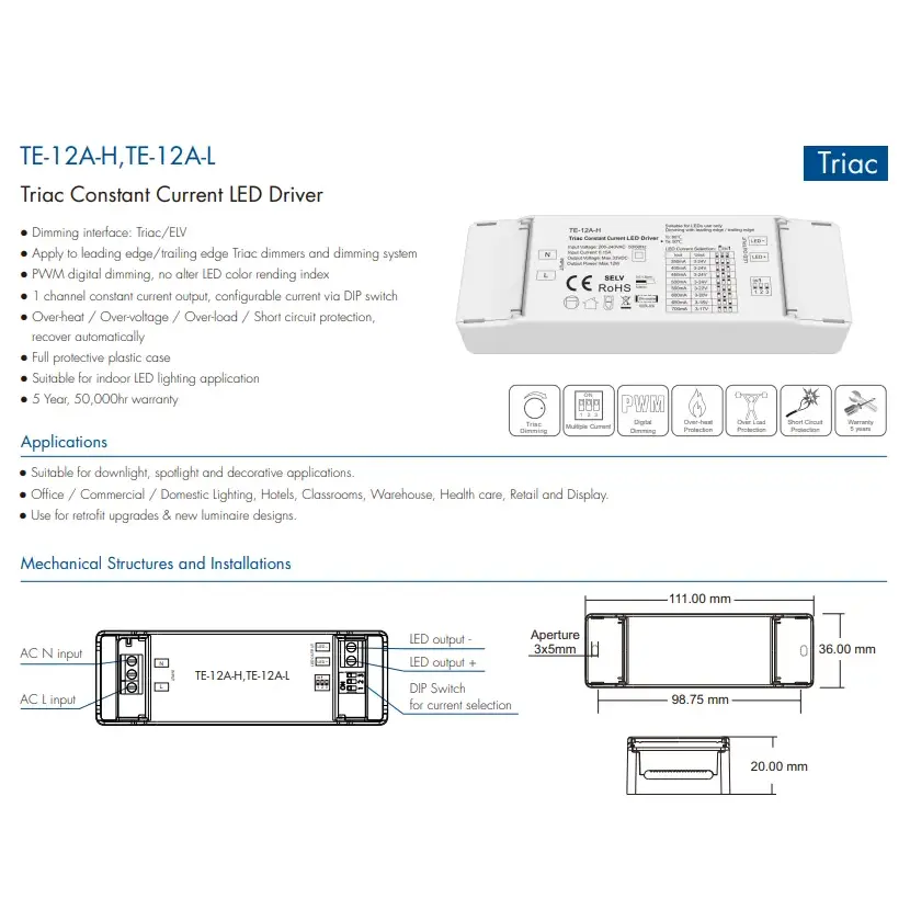 အသေးစားအရွယ်အစား 12W Constant Current Triac Dimmable LED Driver