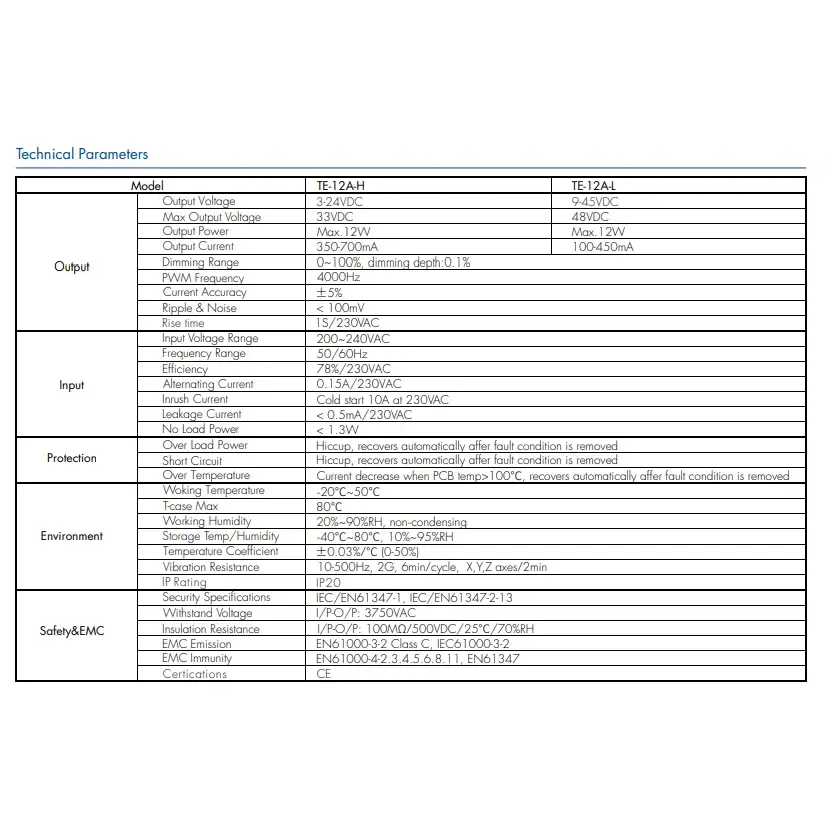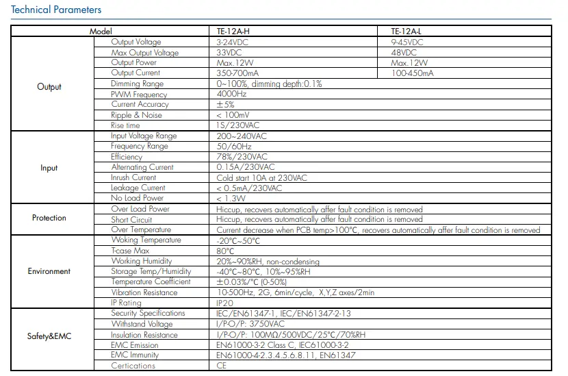 အဝင်ဗို့အား- 200-240VAC 50-60Hz သွင်းအားလက်ရှိ: 0.15A အထွက်ပါဝါ- 12 Watts အများဆုံး အထွက်ဗို့အား: 9 ~ 42V အာမခံ- 2 နှစ် လက်မှတ်-CE/Rohs