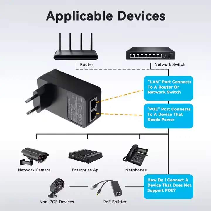 12W POE Adapter Interchangeable Plug POE Injector ကို ကွန်ရက်အမျိုးမျိုးနှင့် လုံခြုံရေးပတ်ဝန်းကျင်များတွင် တွင်ကျယ်စွာအသုံးပြုသည်-