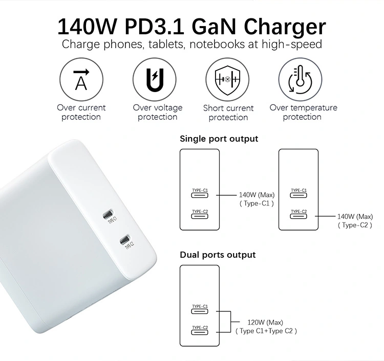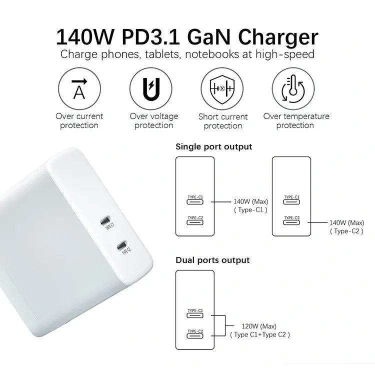 Type-C port နှစ်ခု - PD3.1 နှင့် QC4 ကဲ့သို့သောခေတ်ရေစီးကြောင်း protocol များကိုထောက်ပံ့သည်။ Starwell 140w PD 3.1 Gan Charger သည်မိုဘိုင်းဖုန်းများ, လက်တော့ပ်များ, တက်ဘလက်များနှင့်တစ်ခုချင်းစီကိုပြောင်းပြီး charger မျိုးစုံအတွက်လိုအပ်ချက်များကိုဖယ်ရှားပေးနိုင်သည်။
