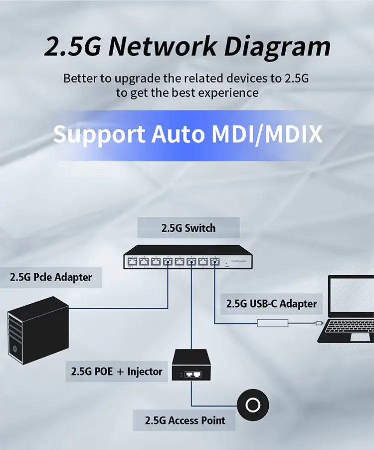 2.5Gbps ဒေတာအမြန်နှုန်းများအတွက် ပံ့ပိုးမှုဖြင့် 10/100/1000Mbps စက်ပစ္စည်းများနှင့် အပြည့်အဝနောက်ပြန်လိုက်နိုင်သော လှိုင်းဘန်းဝဒ်မျဉ်းကွေးကို ကျော်လွန်နေပါ။