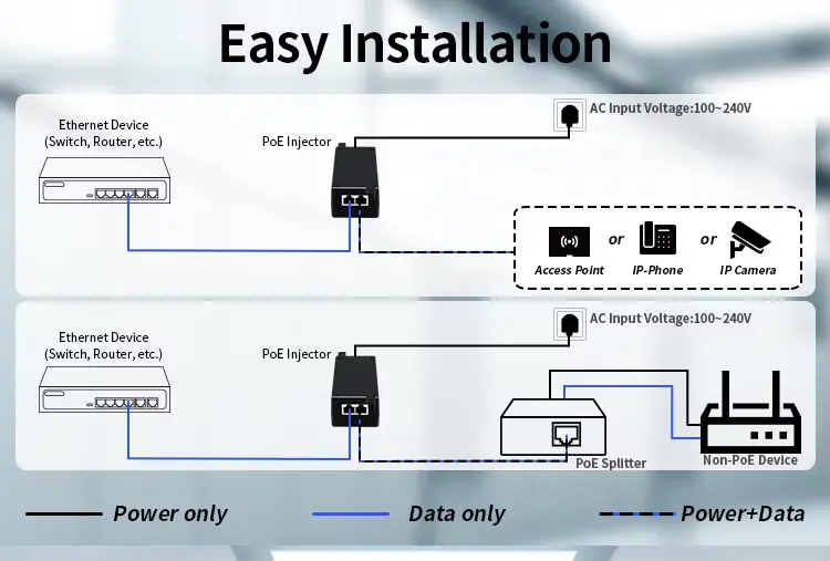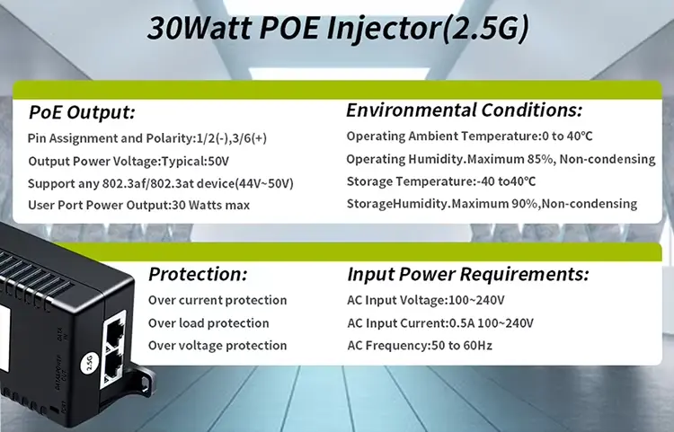 ဤ 30W Poe Injector သည် များစွာသော PoE စံနှုန်းများကို ပံ့ပိုးပေးသောကြောင့် စက်ပစ္စည်းအမျိုးမျိုးအတွက် ပြောင်းလွယ်ပြင်လွယ်ရွေးချယ်မှုတစ်ခုဖြစ်စေသည်။