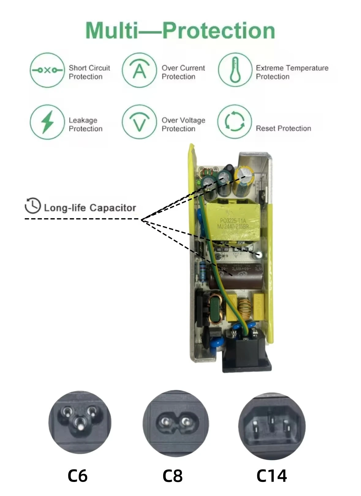ပြီးပြည့်စုံသော ဘေးကင်းရေး အကာအကွယ်များ- Over-Current Protection (OCP)၊ Over-Voltage Protection (OVP) နှင့် Short-Circuit Protection (SCP) အပါအဝင် adapter နှင့် သင်၏ အဖိုးတန် ပစ္စည်း နှစ်ခုလုံးကို ပျက်စီးမှုမှ ကာကွယ်ပေးပါသည်။
