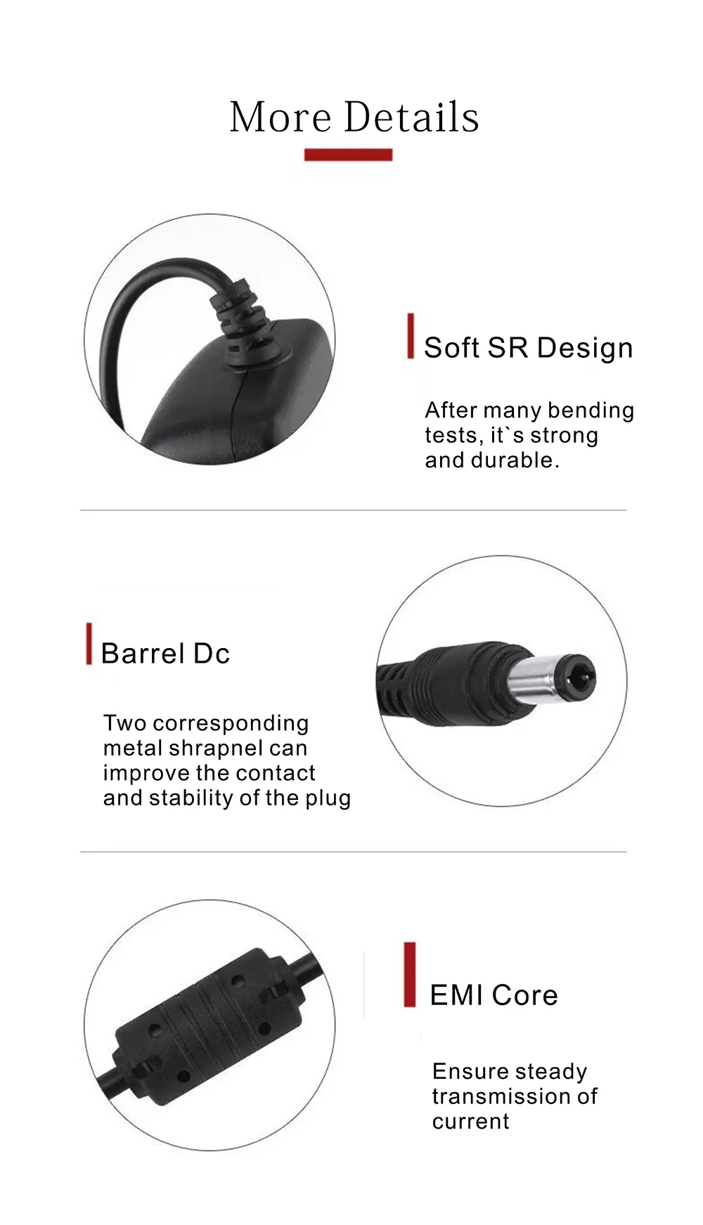 3. Connector Fit- ပလပ်အရွယ်အစား (ဥပမာ 5.5mm x 2.1mm) နှင့် polarity (centre-positive) သည် သင့်စက်၏ DC Jack နှင့် ကိုက်ညီကြောင်း အတည်ပြုပါ။ မတိုက်ဆိုင်မှု သည် ပျက်စီးစေနိုင်သည်။