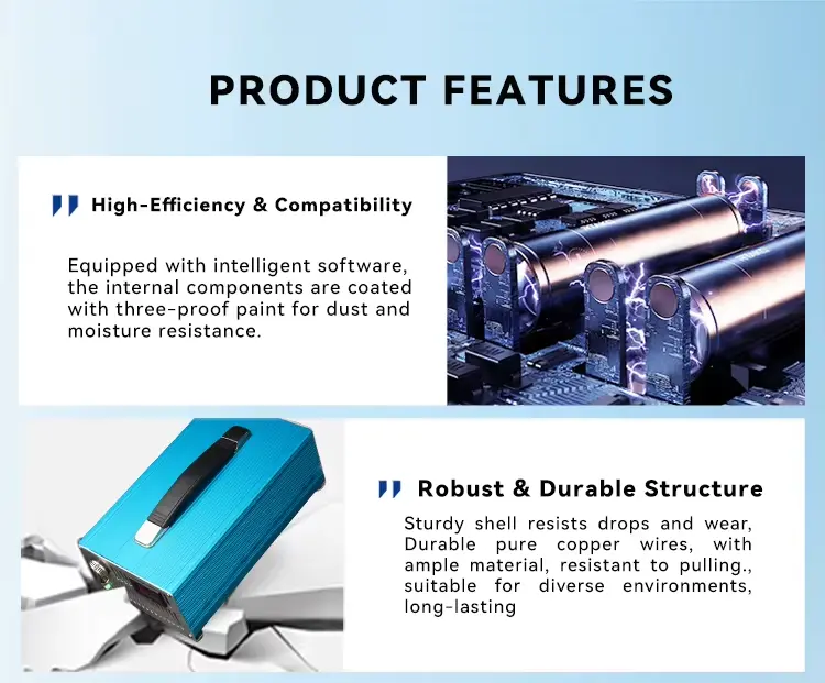 ၎င်းသည် အားအပြည့်သွင်းထားစဉ်တွင် ဘက်ထရီသက်တမ်းကို ထိထိရောက်ရောက် ထိရောက်စွာ အားဖြည့်ပေးသည့် ကြိုတင်အားသွင်းမှု၊ စဉ်ဆက်မပြတ်လက်ရှိ၊ အဆက်မပြတ်ဗို့အားနှင့် ဖလိုဂျစ်အဆင့် လေးဆင့်အားသွင်းယုတ္တိကို အသုံးပြုထားသည်။ အပြည့်အဝ အကာအကွယ် ယန္တရားများ တွင် ဗို့အား လွန်ခြင်း၊ လက်ရှိ ထက်လွန်ခြင်း၊ အပူချိန် လွန်ကဲခြင်း၊ တိုတောင်းသော ပတ်လမ်း နှင့် ပြောင်းပြန်-ဝင်ရိုးစွန်း ကာကွယ်ရေး၊ လုပ်ငန်းလည်ပတ်မှု ဘေးကင်းရေးနှင့် ယုံကြည်စိတ်ချရမှုကို မြှင့်တင်ပေးခြင်း ပါဝင်သည်။ အားသွင်းကိရိယာသည် အားအပြည့်သွင်းပြီးနောက် အလိုအလျောက် ပါဝါပိတ်ခြင်းကို ပံ့ပိုးပေးကာ သုံးစွဲသူများကို ကိုယ်တိုင်စောင့်ကြည့်ခြင်းမှ ကင်းဝေးစေပါသည်။