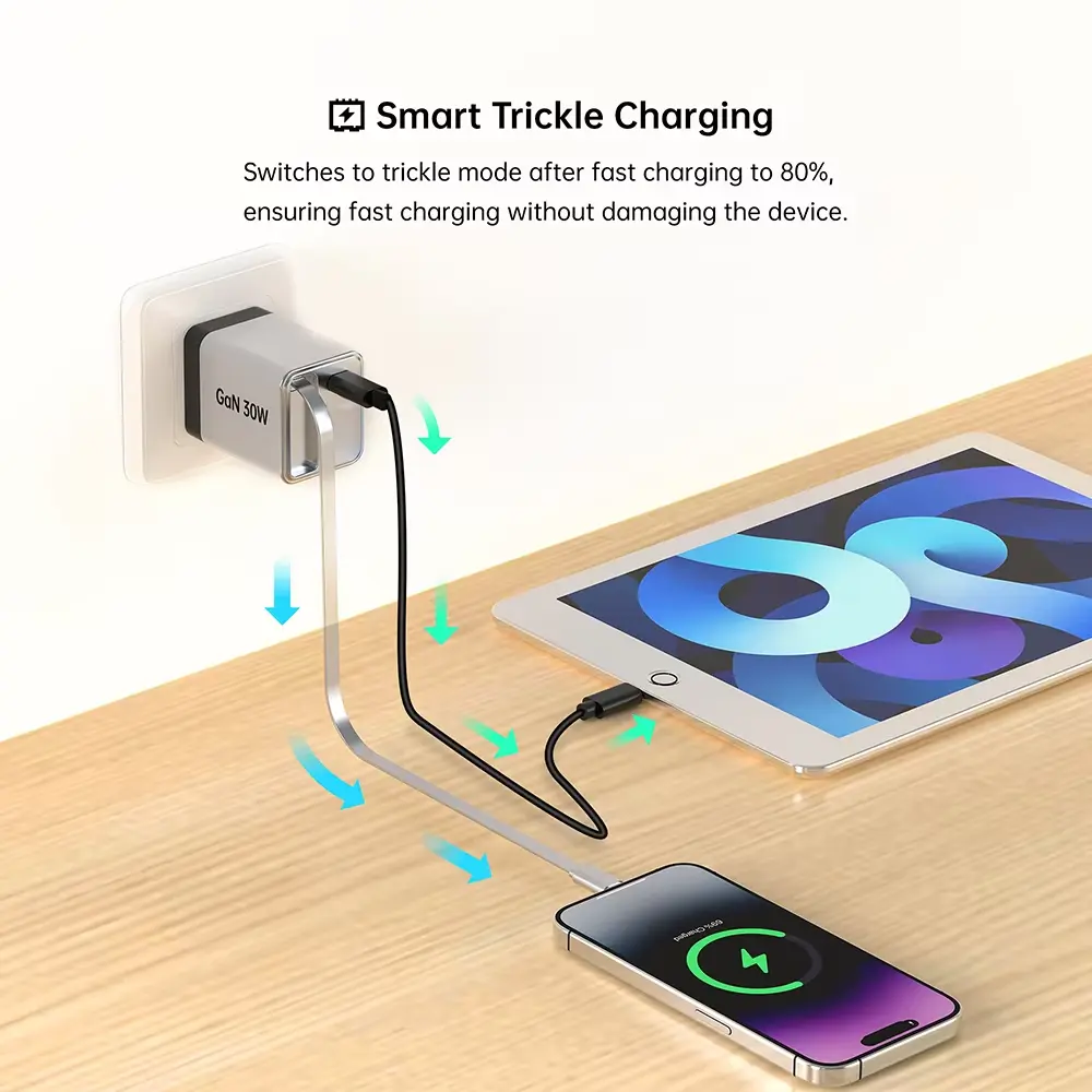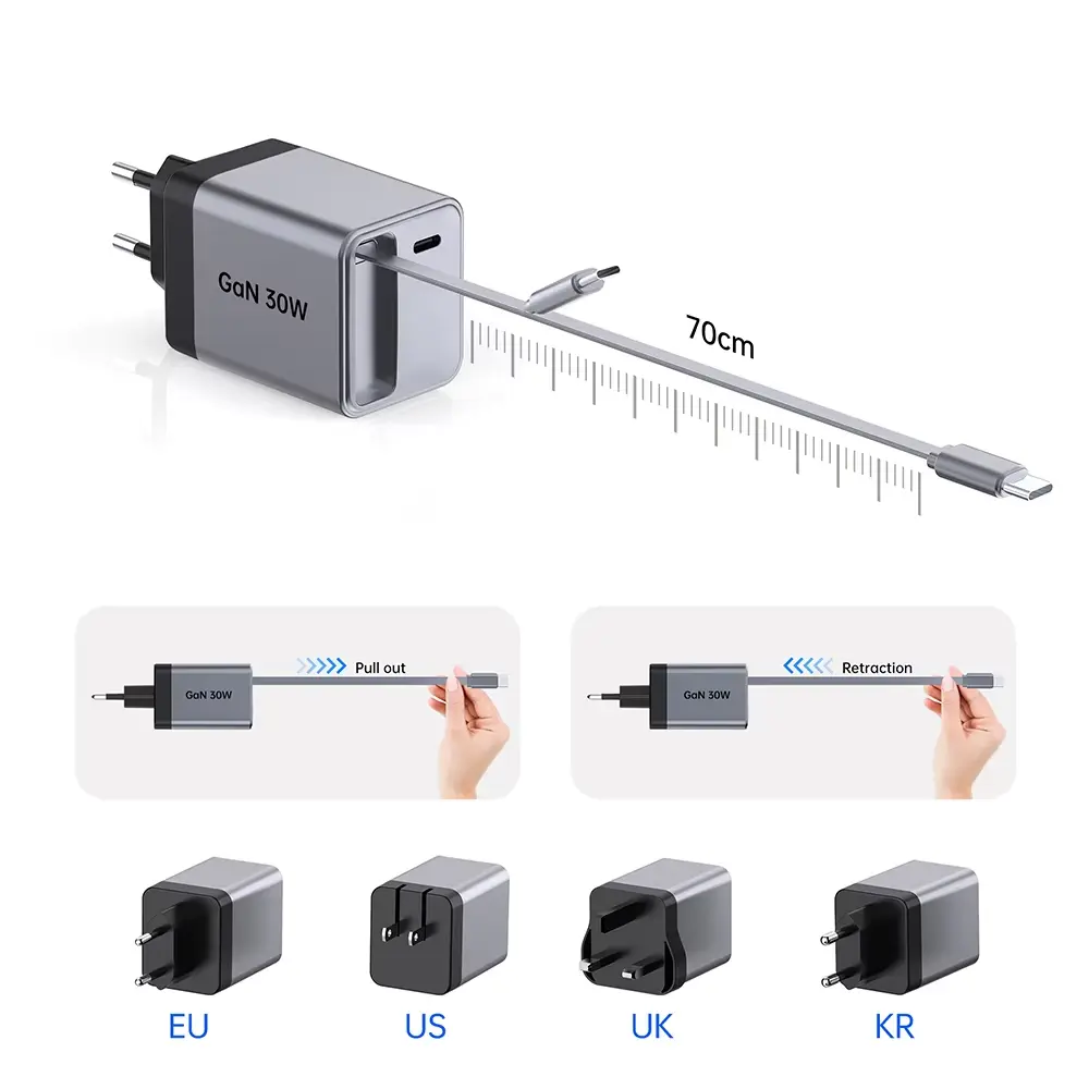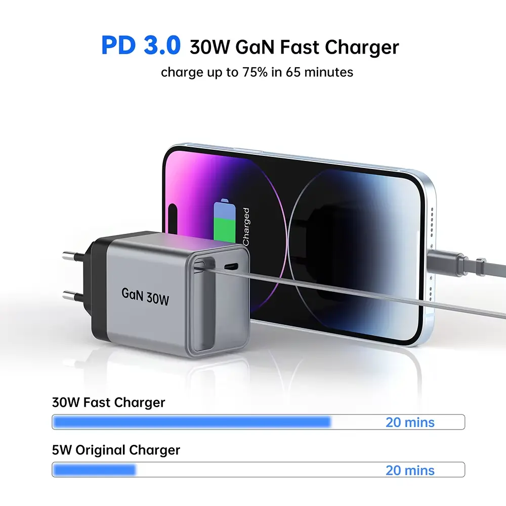 ပြန်လည်ရုပ်သိမ်းနိုင်သောအမျိုးအစား C corder ၏ Ultra-Lightweight ၏ Ultra-Lightweight, အိတ်ကပ်အရွယ်ဒီဇိုင်းနှင့်အတူ 30w အမြန်အားသွင်းစက်သည်၎င်းကိုပတ်ပတ်လည်သယ်ဆောင်ရန်လွယ်ကူစေသည်။ ၎င်းသည်အိမ်, ရုံးခန်း, ခရီးသွားခြင်းအတွက်အကောင်းဆုံးရွေးချယ်မှုဖြစ်သည်။