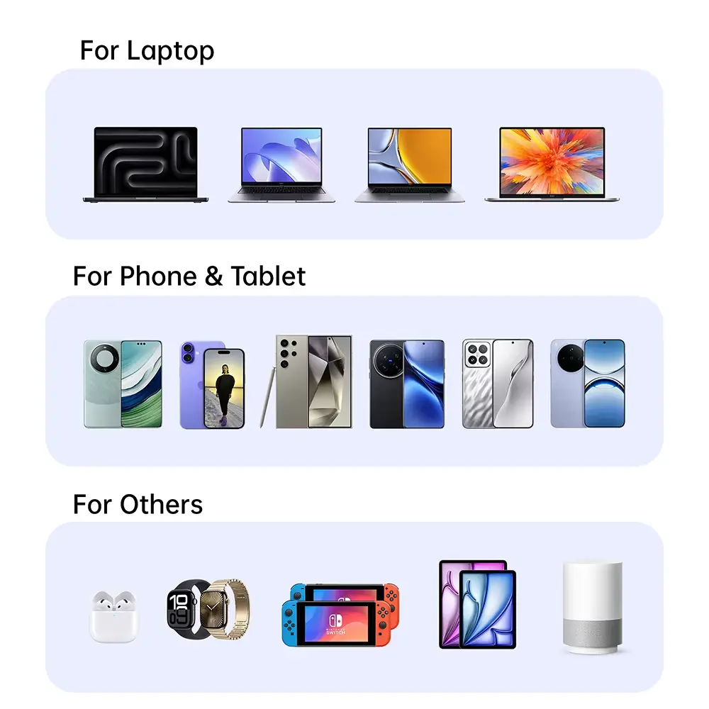 မိုဘိုင်းဖုန်းများ, နားကြပ်များနှင့်ဂိမ်းဆက်စပ်ပစ္စည်းများအပါအ 0 င် USB-C devices များနှင့်သဟဇာတဖြစ်သည်။ စက်ပစ္စည်းလိုအပ်ချက်များကိုလုံခြုံပြီးထိရောက်သောအားသွင်းရန်အတွက်လိုအပ်သည့်ကိရိယာများကိုအလိုအလျောက်ရှာဖွေသည်။ 4.travel-အဆင်သင့်သယ်ယူပို့ဆောင်ရေး