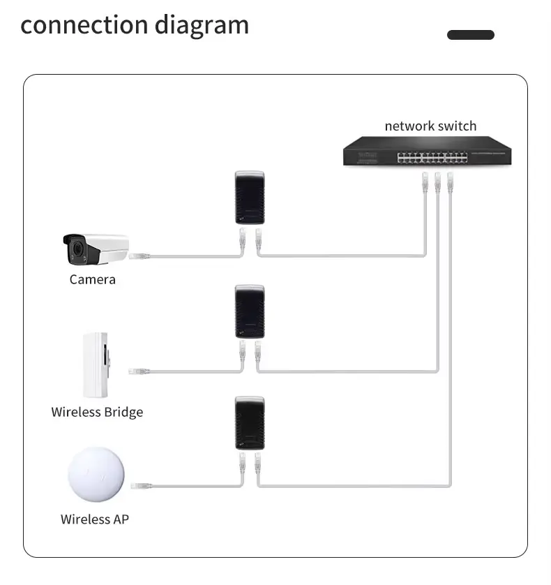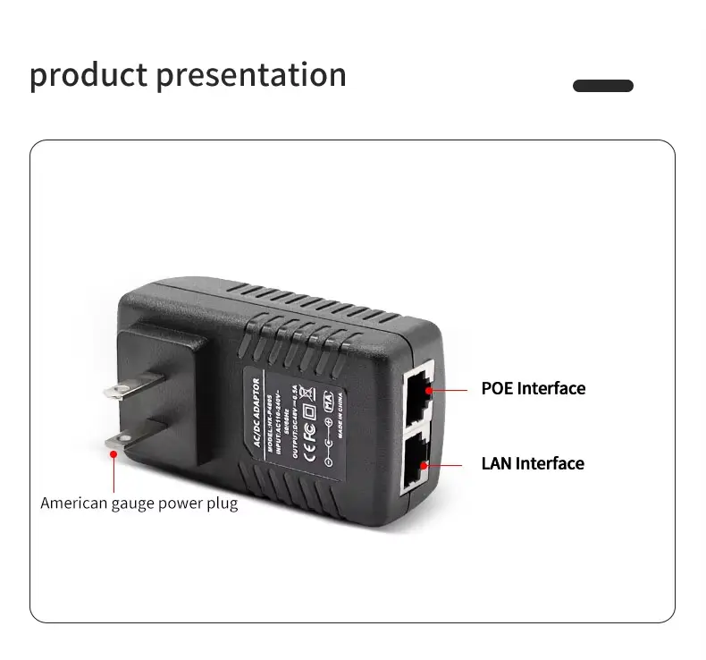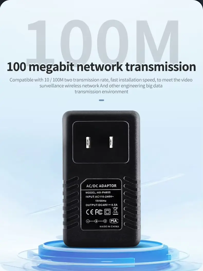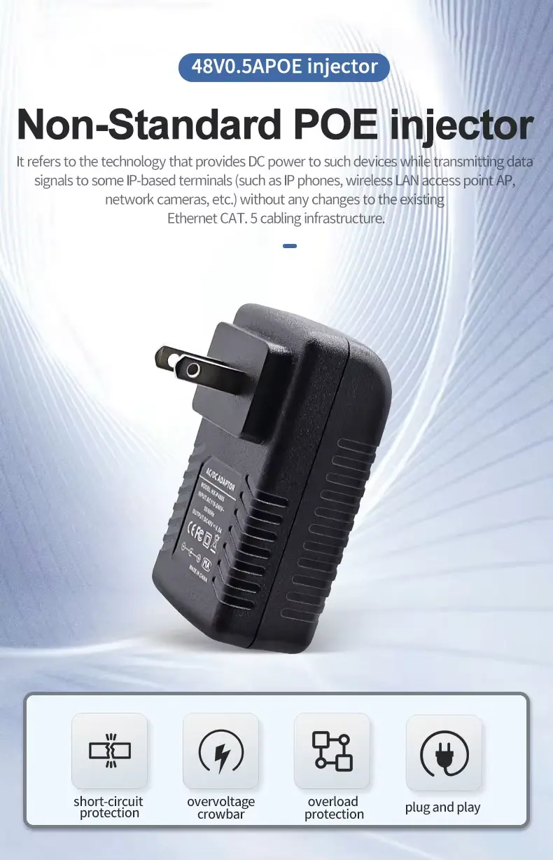 အရေးကြီးသော လိုက်ဖက်ညီမှု မှတ်ချက်- ဤအရာသည် Passive PoE injector ဖြစ်သည်။ ချိတ်ဆက်ထားသော စက်နှင့် လက်ဆွဲနှုတ်ဆက်ခြင်း မလုပ်ဆောင်ပါ။ မချိတ်ဆက်မီ သင့်လက်ခံရရှိသည့်စက်ပစ္စည်းသည် 48V Passive PoE (သို့မဟုတ် 48V ပါဝင်သော အကွာအဝေး) အတွက် အထူးအဆင့်သတ်မှတ်ထားကြောင်း သေချာပါစေ။ 5V၊ 12V၊ သို့မဟုတ် 24V မျှော်လင့်ထားသော စက်ပစ္စည်းသို့ ချိတ်ဆက်ခြင်းသည် ပျက်စီးစေနိုင်သည်။