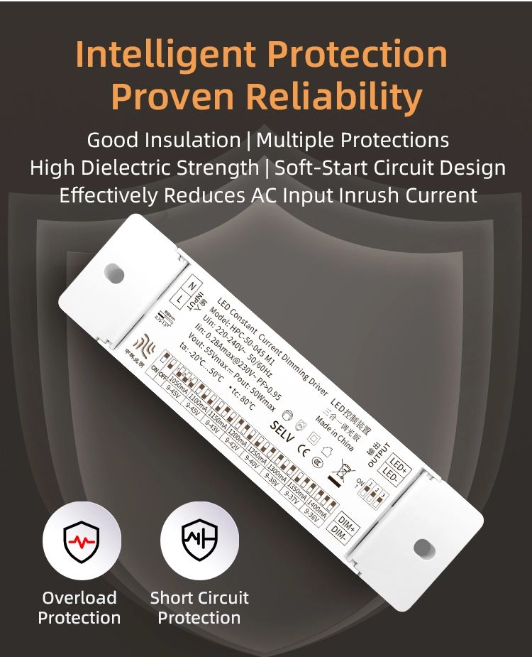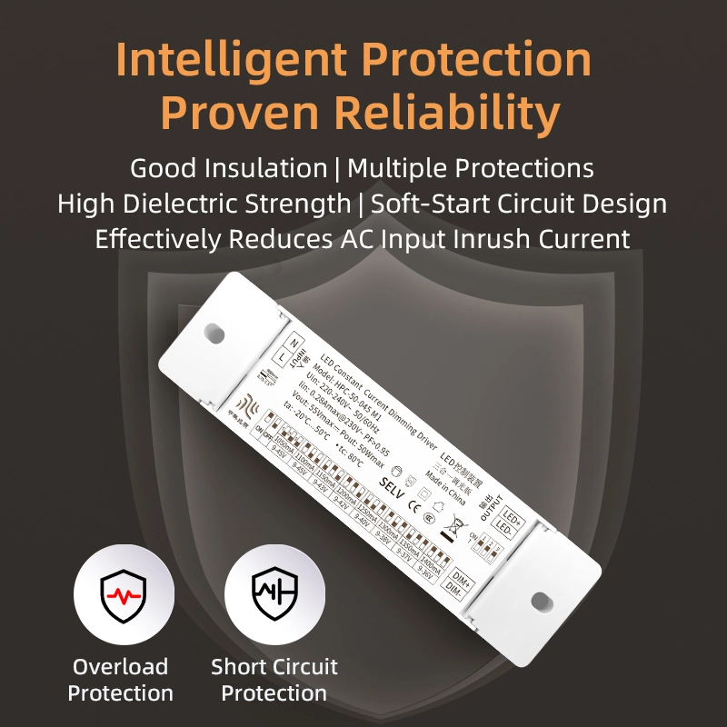Multiple Protection Design- ကာကွယ်မှုယန္တရား လေးခုဖြင့် တည်ဆောက်ထားသည်- overvoltage (ကာကွယ်မှုအဆင့် ≥55V), overcurrent (အကာအကွယ်အဆင့် ≥0.18A), short circuit နှင့် overheating (protect temperature ≥110℃)။ ယာဉ်မောင်းနှင့် LED မီးရင်းမြစ်များ ပျက်စီးခြင်းမှ ကာကွယ်ရန် ပုံမှန်မဟုတ်သော လုပ်ငန်းခွင်အခြေအနေများတွင် လျင်မြန်စွာ အထွက်ကို ဖြတ်တောက်နိုင်သည်။