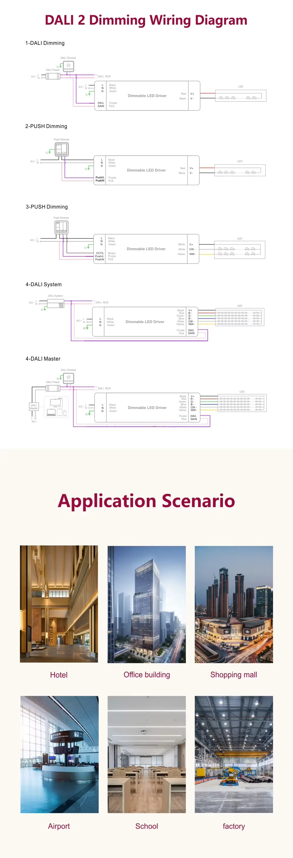 DALI Constant Current CCT Dimming Led Driver သည် အဆင့်မြင့်ဗိသုကာလက်ရာများ၊ စီးပွားရေးနှင့် ဧည့်ဝတ်ပြုမှု ပရောဂျက်များအတွက် သင့်လျော်ပြီး ၎င်းသည် ယာဉ်မောင်းတစ်ခုတည်းမှ အလင်းအရောင်အပူချိန်နှင့် ပြင်းထန်မှုကို တိကျသောချိန်ညှိမှုကို အားကောင်းစေသည်။ DALI-2 DT8 သည် ခေတ်မီဆန်းပြားသော မြင်ကွင်းများနှင့် စွမ်းအင်စီမံခန့်ခွဲမှုအတွက် အနာဂတ်တွင် သက်သေပြနိုင်ပြီး အပြန်အလှန်ထိန်းကျောင်းနိုင်စေမည့် ထိန်းချုပ်မှုကို အာမခံပေးကာ Manual Push Dimming option သည် သီးခြားထိန်းချုပ်မှုစနစ်မလိုအပ်သည့် တပ်ဆင်မှုကို ရိုးရှင်းစေသည်။