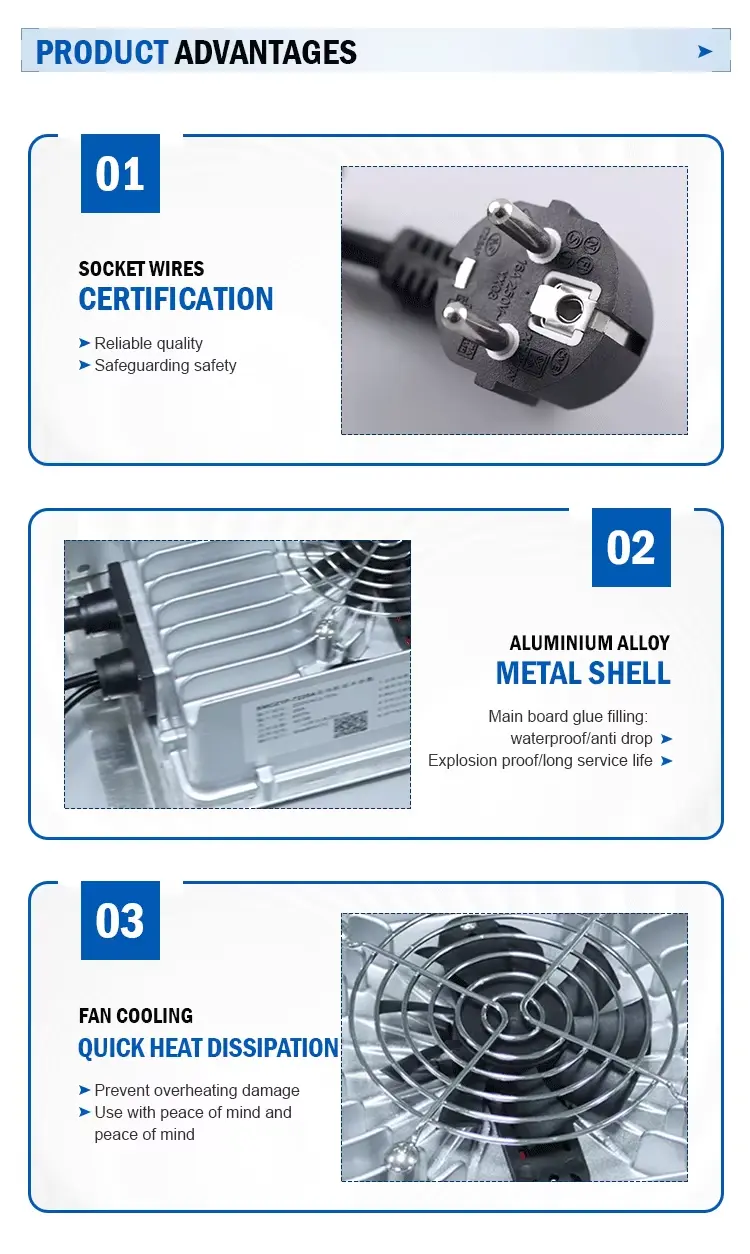 မြင့်မားသော စွမ်းဆောင်ရည်နှင့် စမတ်ကျသော ကာကွယ်မှု- 93% ထိရောက်မှု နှင့် ပါဝါအချက် ≥0.98 အထိ ရရှိခြင်း၊ ဤအားသွင်းကိရိယာသည် စွမ်းအင်ဆုံးရှုံးမှုကို နည်းပါးစေပြီး လည်ပတ်မှုကုန်ကျစရိတ်ကို လျှော့ချပေးသည်။ Built-in ကာကွယ်မှုတွင် ဗို့အားလွန်ခြင်း၊ တိုတောင်းသော ဆားကစ်၊ ပြောင်းပြန်ဝင်ရိုးစွန်းနှင့် အပူချိန်လွန်ကဲခြင်း အကာအကွယ်များ ပါဝင်သည်။ LED အချက်ပြမှုတစ်ခုသည် တစ်ချက်ကြည့်လိုက်လျှင် အားသွင်းမှုအခြေအနေကို ရှင်းရှင်းလင်းလင်းပေးပါသည်။