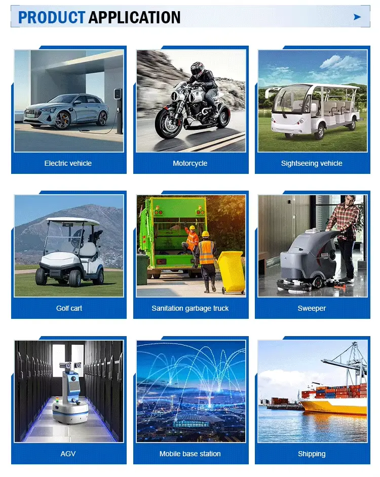 အသုံးပြုမှု- မော်တော်ဆိုင်ကယ်/စကူတာ၊ သုံးဘီးဆိုင်ကယ်၊ ကောက်ရိုးဖြတ်စက်၊ တံမြက်လှည်း၊ ဖော့ကား၊ ထရပ်ကား၊ လျှပ်စစ်ဘတ်စ်၊ ခဲအက်ဆစ်ဘက်ထရီ၊ လျှပ်စစ်ယာဉ်၊ ခရီးသွားယာဉ်၊ ထောက်ပံ့ပို့ဆောင်ရေးယာဉ်၊ သန့်ရှင်းရေးယာဉ်၊ ကင်းလှည့်ကား၊ Dune buggies၊ သင်္ဘော၊ ဆက်သွယ်ရေးပစ္စည်း