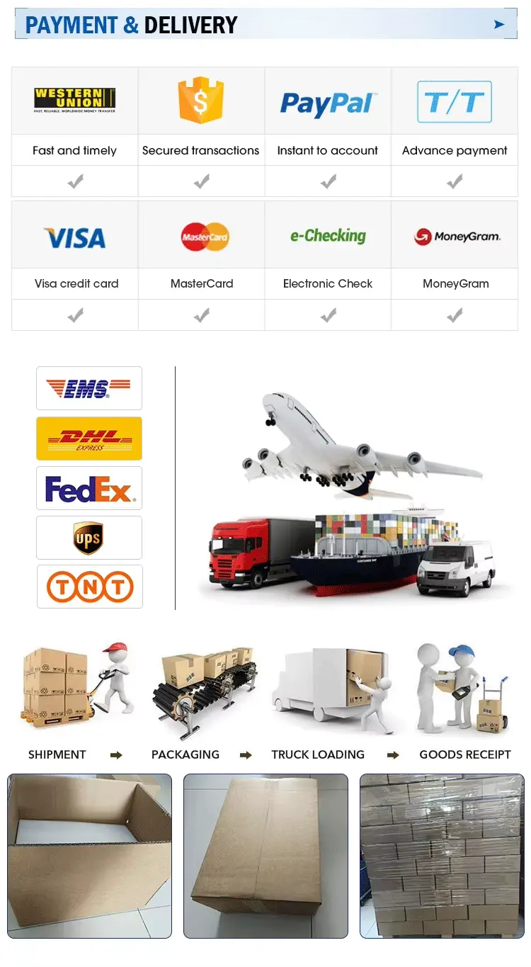 A4: အသေးစားအမှာစာများ (FEDEX၊ DHL၊ EMS၊ TNT) ဖြင့် ပို့ဆောင်ပေးပါသည်။ ကြီးမားသော အမှာစာများသည် ပင်လယ် သို့မဟုတ် လေကြောင်းဖြင့် တင်ပို့သည်။ FOB စျေးနှုန်းရရှိနိုင်ပါသည်။ သင်သည် သင်၏ ပေးပို့သူ သို့မဟုတ် ကျွန်ုပ်တို့၏ ပစ္စည်းကို အသုံးပြုနိုင်သည်။