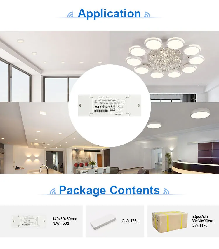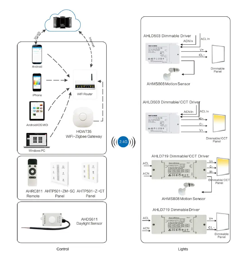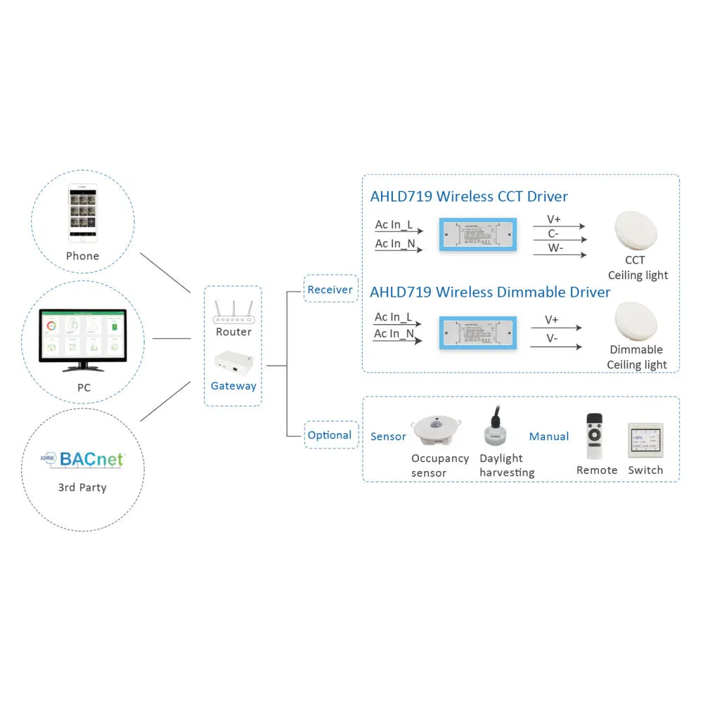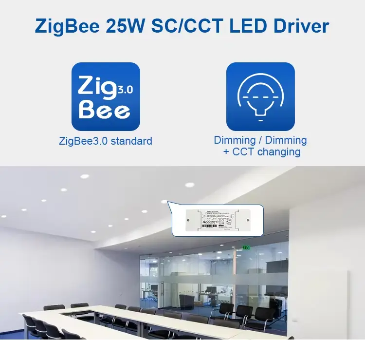 ယာဉ်မောင်းသည် Zigbee mesh ကွန်ရက်အတွင်း လည်ပတ်ပြီး အချိန်ဇယားဆွဲခြင်း၊ မြင်ကွင်းထိန်းချုပ်မှု၊ အုပ်စုထိန်းချုပ်မှုနှင့် အလိုအလျောက်လုပ်ဆောင်ခြင်းကဲ့သို့သော စမတ်အလင်းရောင်လုပ်ဆောင်ချက်များကို ဖွင့်ရန်အတွက် Zigbee တံခါးပေါက်သို့ ချိတ်ဆက်သည်။ ဤ LED Driver အမျိုးအစားကို စမတ်အိမ်အလင်းရောင်စနစ်များ၊ စီးပွားဖြစ်အလင်းရောင် တပ်ဆင်မှုများနှင့် အသိဉာဏ်ရှိသော အဆောက်အဦထိန်းချုပ်မှုပတ်ဝန်းကျင်များတွင် အသုံးများသည်။