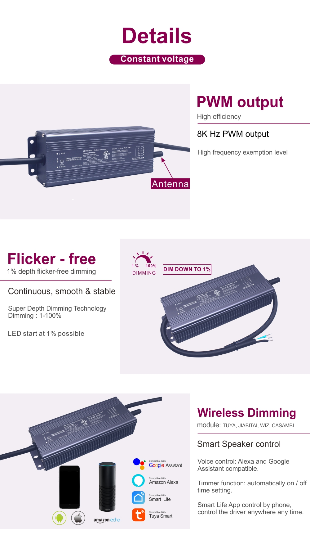 လိုအပ်ချက်ရှိသောပတ်ဝန်းကျင်များအတွက် ဒီဇိုင်းထုတ်ထားပြီး၊ ဤ Tuya Zigbee အဆက်မပြတ်ဗို့အား 24V ဦးဆောင်သော ဒရိုင်ဘာသည် စွမ်းဆောင်ရည်နှင့် တာရှည်ခံမှုကို ပေါင်းစပ်ထားသည်။